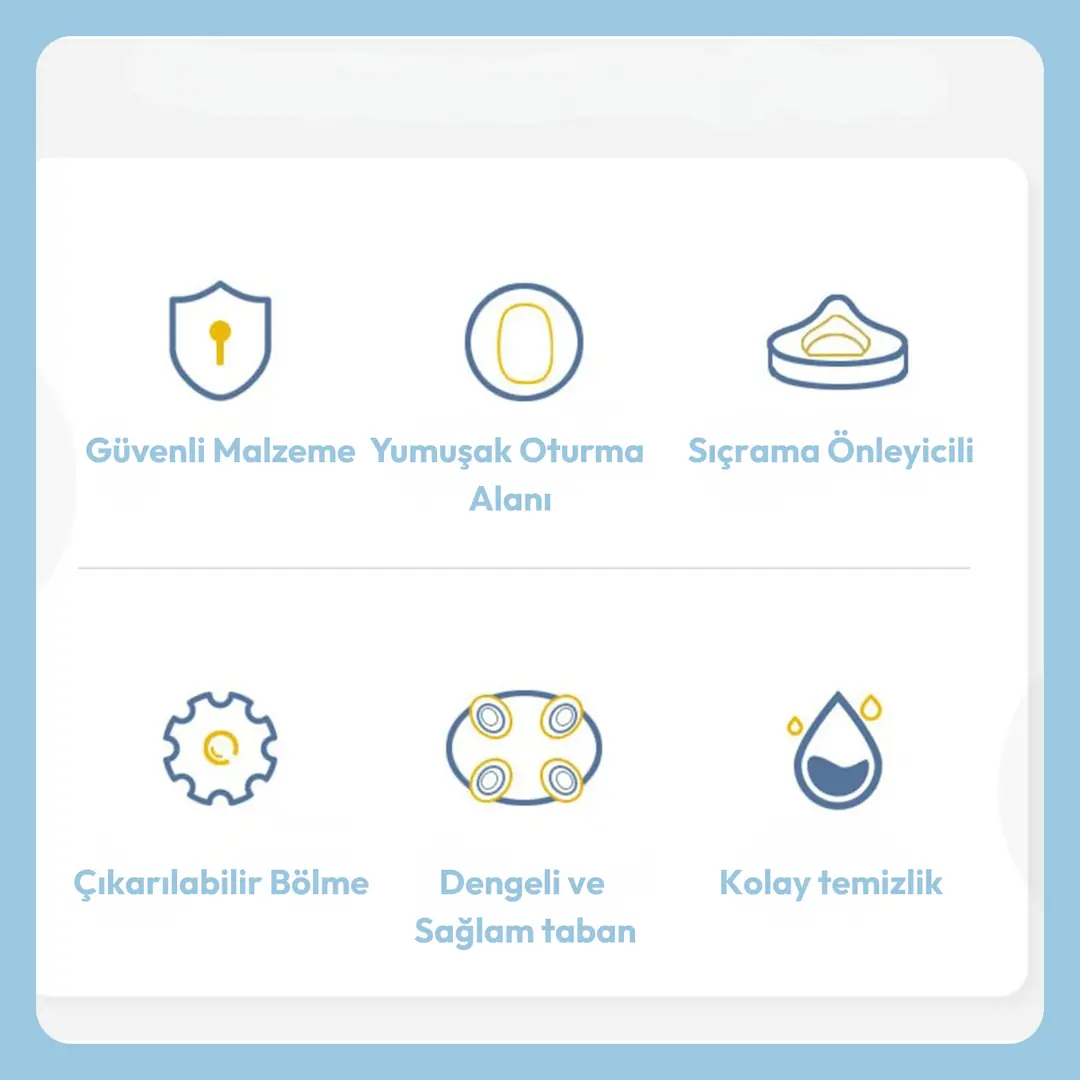 - Oturma bölümü, çocukların temiz kalmasını sağlayan sıçrama önleyici (anti-splash) bir tasarıma sahiptir.